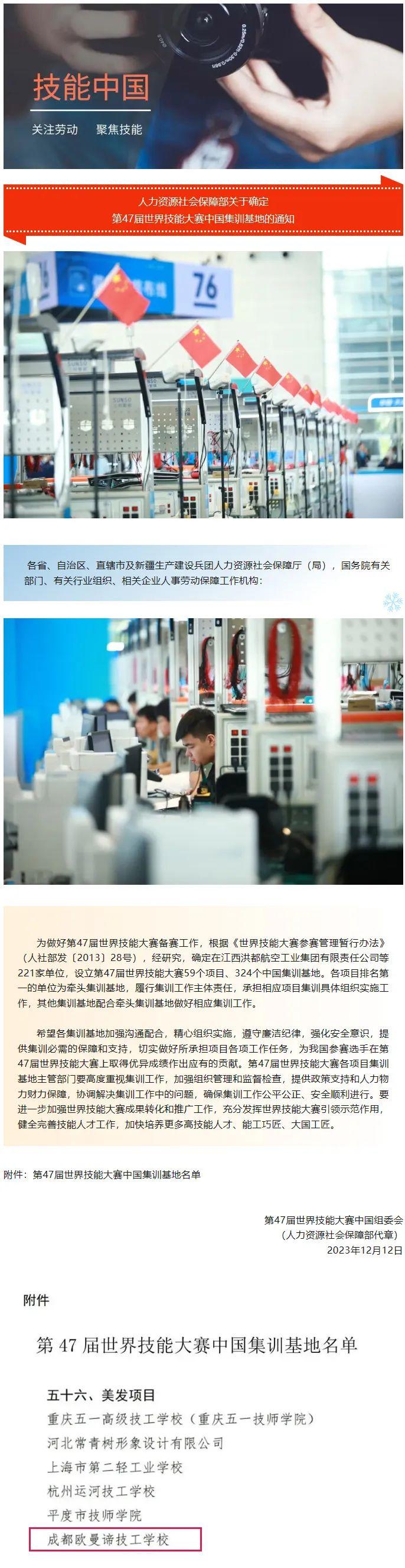近日,接《人力资源社会保障部关于确定第47届世界技能大赛中国集训基地的通知》,成都欧曼谛技工学校成功获批为第47届世界技能大赛美发项目中国集训基地。为进一步加快培养更多高技能人才、能工巧匠,促进更多高技能人才脱颖而出,第47届世界技能大赛国内集训工作即将正式启动,成都欧曼谛技工学校将按照人社部相关要求,制定完善的集训方案,切实做好所承担项目的集训工作,确保集训工作顺利进行。