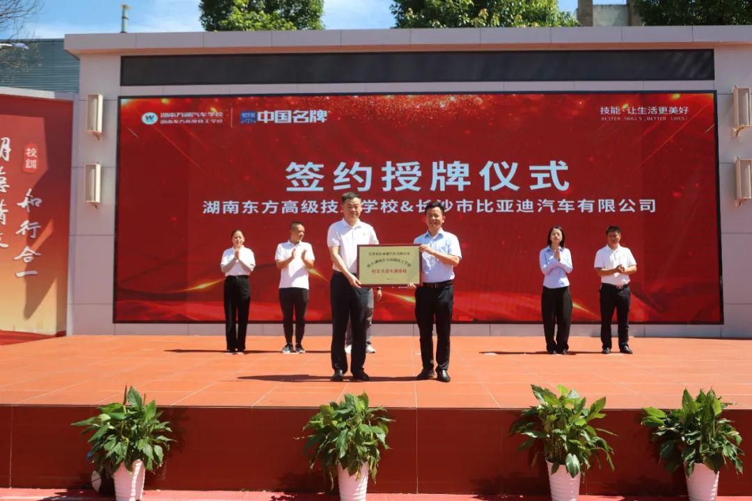 7月4日,湖南东方高级技工学校与长沙市比亚迪汽车有限公司在校园内隆重举行了校企合作签约仪式,共同见证了双方在产教融合道路上的又一重要里程碑。双方代表共同签署了合作协议,长沙市比亚迪汽车有限公司对授予我校“校企共建实训基地”荣誉牌匾,并赠予学校2辆比亚迪宋作为实训用车,以支持学校的教学实践和学生的技能提升。