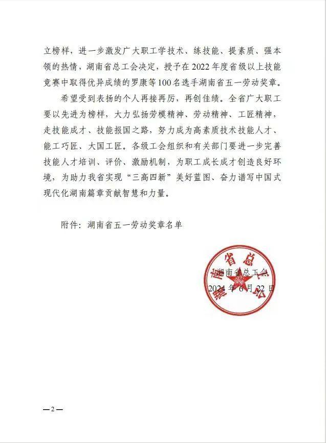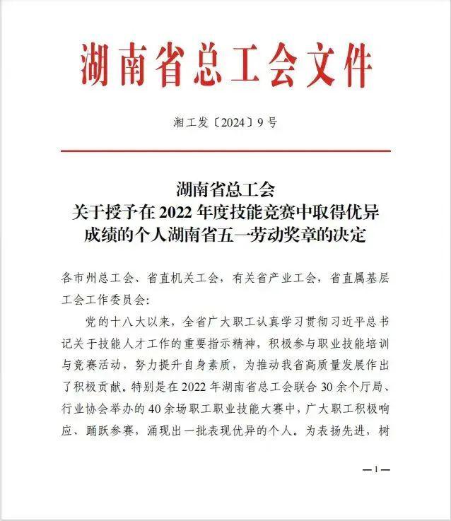 近日,湖南省总工会发文通报2022年度技能竞赛选手“五一劳动奖章”名单,我校教师林存海荣获“湖南省五一劳动奖章”称号。